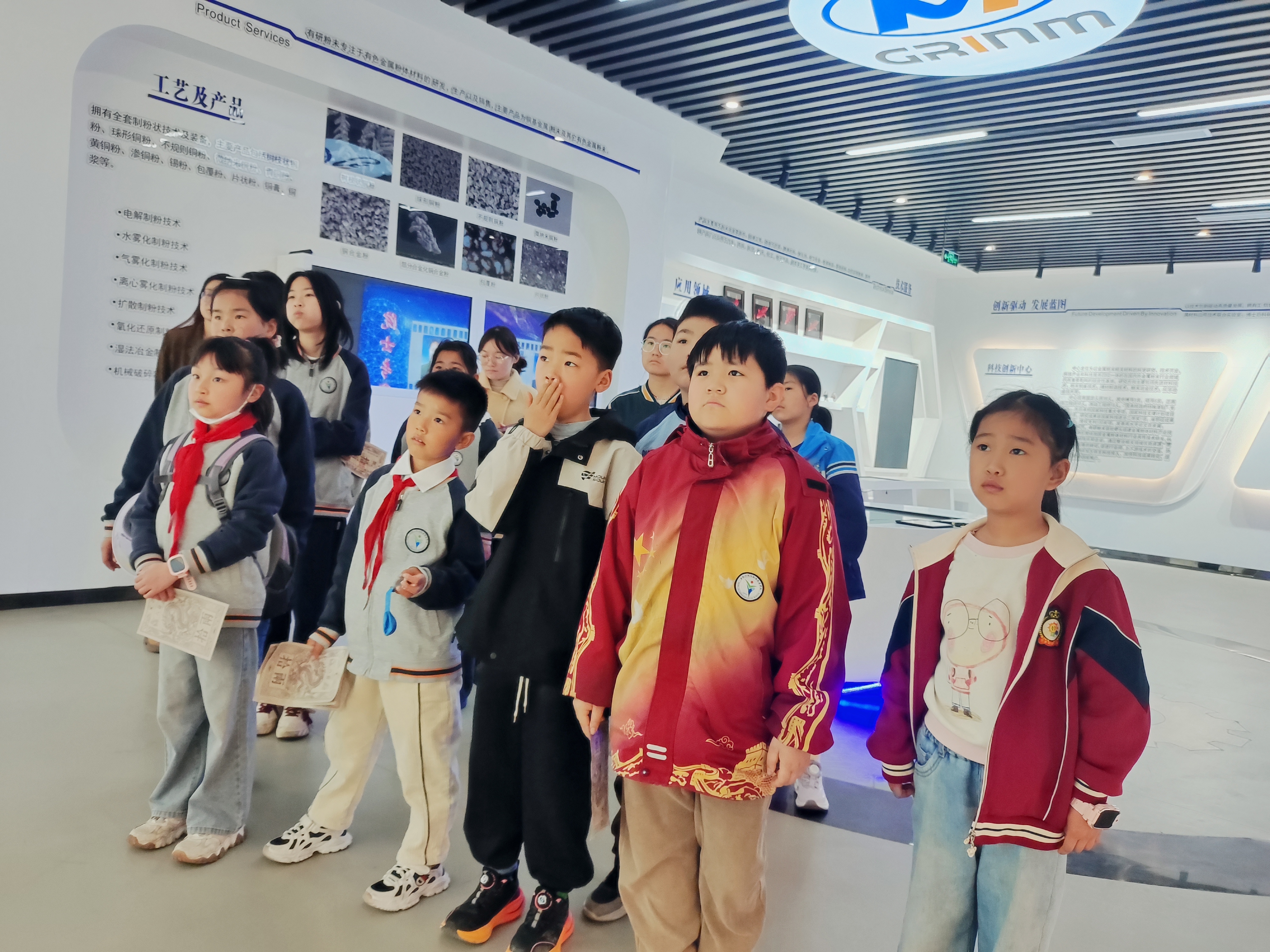 活动起始,小朋友们依序进入公司展厅。面对不同规格的粉末产品以及应用场景模型,孩子们满是好奇,不时发出惊叹之声。