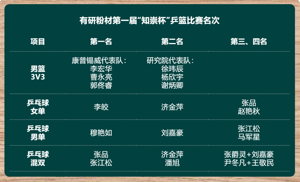无论是儿时的课外教育,还是高中的课余活动,勤加练习都是取胜的关键。康普锡威代表队在男篮3V3胜出,张品和张江松在乒乓球混双中夺冠,这和他们在工作之余的锻炼密不可分,康普锡威的篮球场和乒乓球案板为员工们提供了良好的体育锻炼条件。