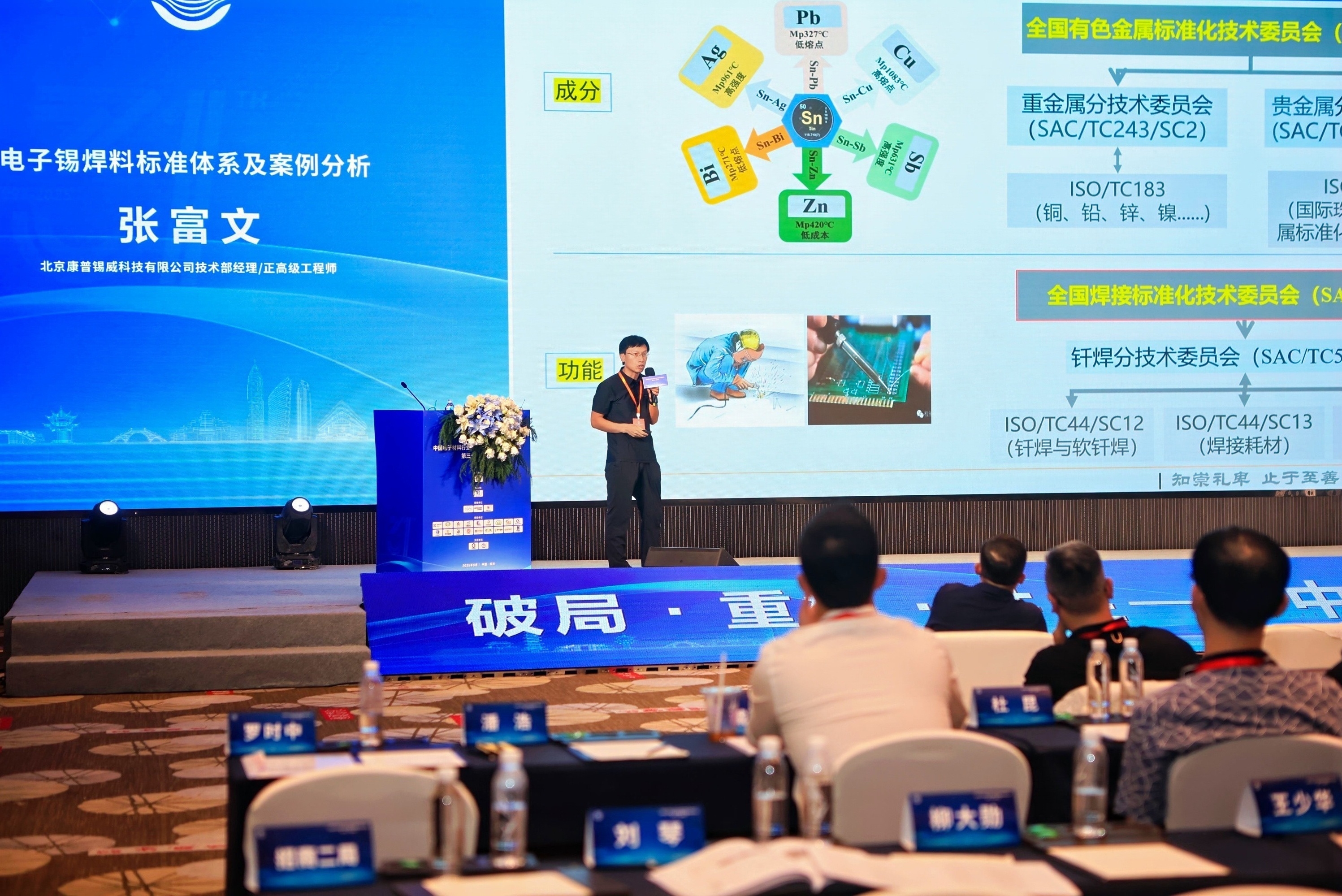 康普锡威研发负责人张富文教授受邀作了题为《电子锡焊料标准体系及案例分析》的专题报告,详细论述了当前国内外电子焊料的标准体系建设情况及行业展望。