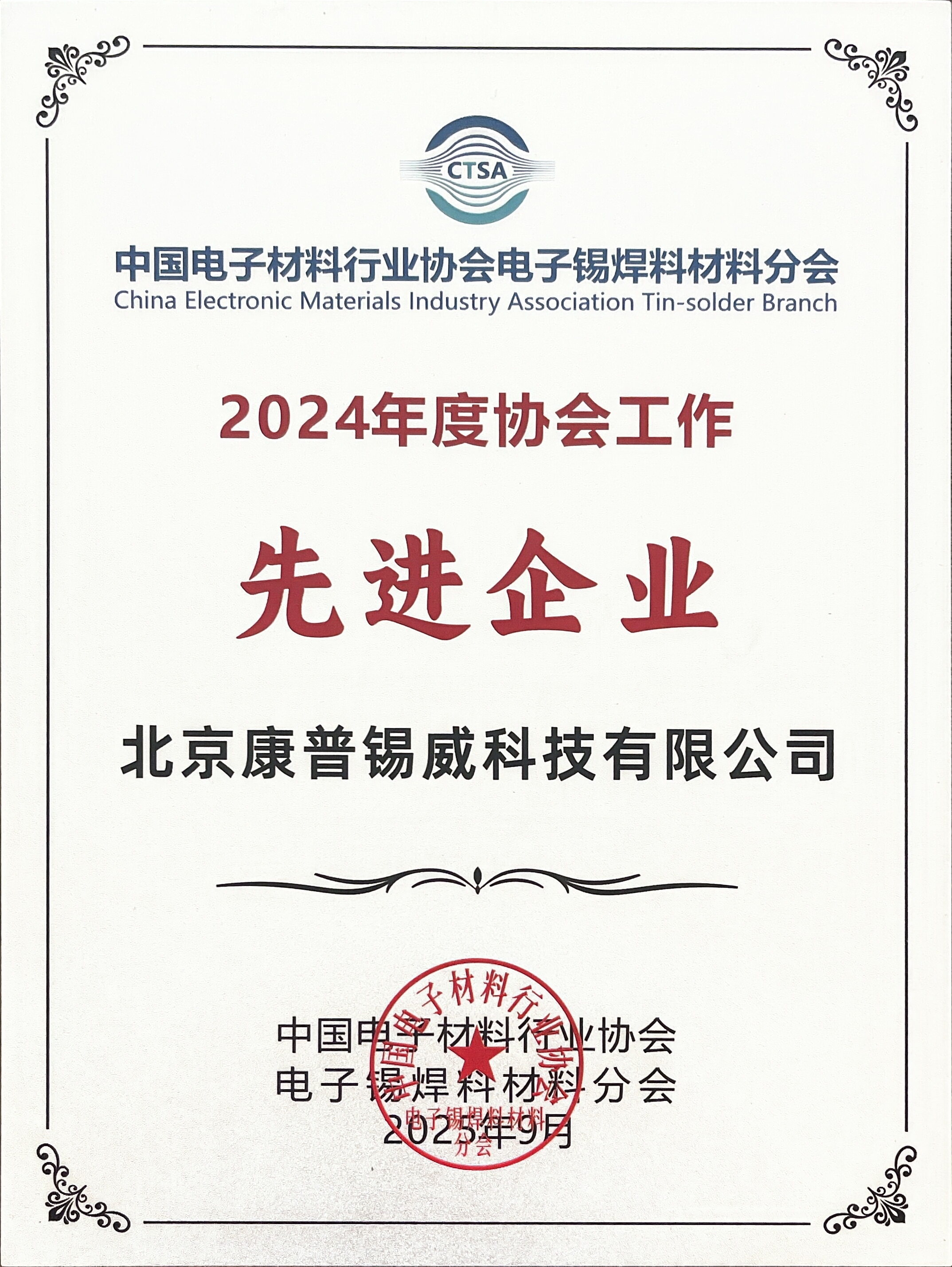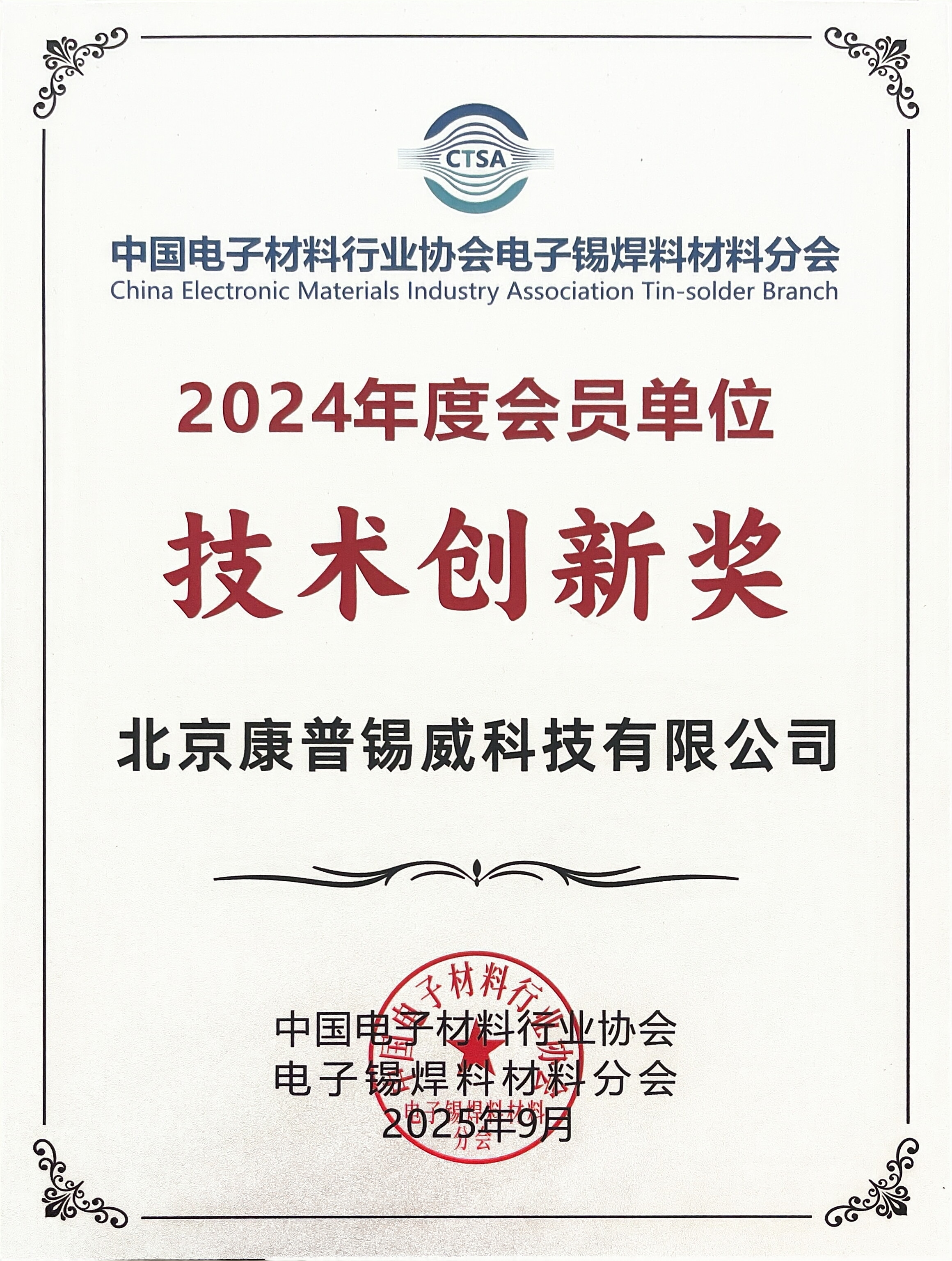 大会期间,为总结经验、表彰先进、研判形势、提振信心,推动新域新质发展,中国电子锡焊料材料分会围绕行业排名、技术贡献等方面开展了多项评比。康普锡威作为副理事长单位,荣获2024年度“中国电子锡焊料行业综合排序前二十企业”与“协会工作先进企业”称号,副总经理刘希学代表公司接受授牌。同时,基于康普锡威在科技创新与行业引领方面的突出表现,公司还被授予“技术创新奖”。