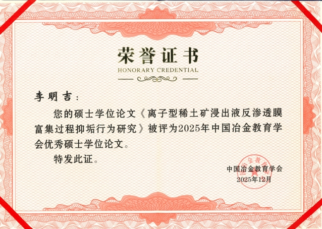 优秀硕士学位论文获得者李明吉,稀土国家工程研究中心2024届硕士毕业生,导师为冯宗玉,研究方向为离子型稀土矿浸出液反渗透膜富集过程抑垢行为研究。攻读学位期间,参与横纵向科研项目3项,发表JCR 1区学术论文1篇,影响因子7.2,获评2024年度北京有色金属研究总院优秀硕士学位论文。
