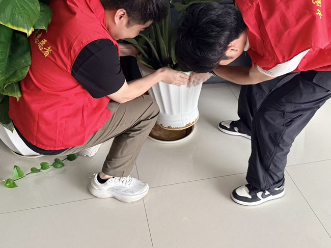当前正值春季气温回升,蚊虫滋生活跃,为预防登革热和基孔肯雅热“双热”传播。本次志愿服务重点对办公区绿植盆栽、花盆托盘等易积水区域进行翻盆倒罐、清理积水,并对垃圾桶周边、茶水间、下水道口等重点区域进行清洁消杀。同时,志愿者们还深入实验室,对活化台等储水设备进行检查,确保无蚊虫滋生,从源头遏制蚊虫孳生隐患。